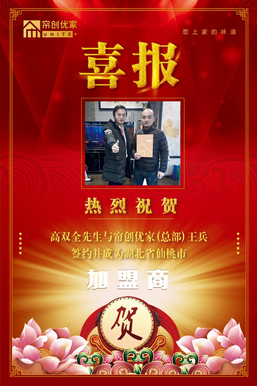 祝贺【高双全】先生与香蕉视频污版在线观看优家总部大区经理王兵成功签约,成为湖北省仙桃市的加盟商。