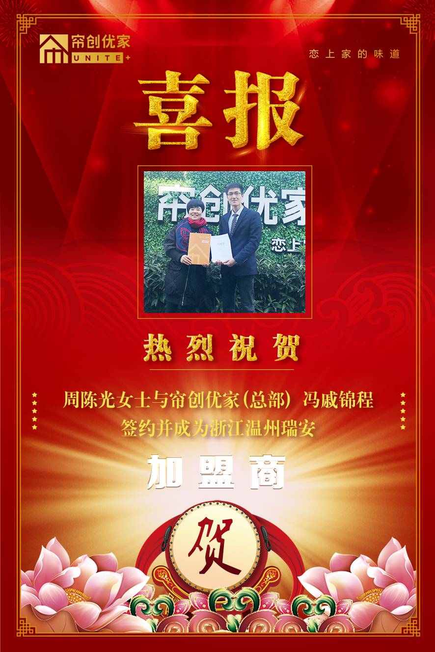 祝贺【周陈光】女士与香蕉视频污版在线观看优家的大区经理冯戚锦程签约,成为了浙江省温州市瑞安的加盟商。