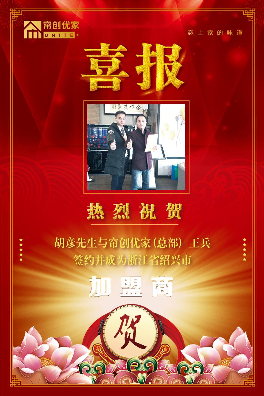 祝贺【胡彦】先生到香蕉视频污版在线观看优家总部与大区经理王兵进行了签约,成为了绍兴市的加盟商。